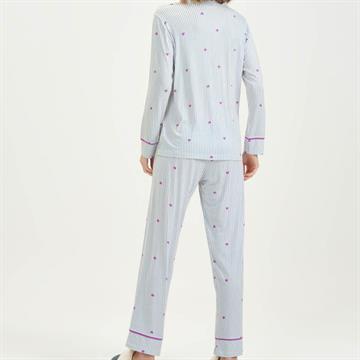 Pijama manga longa com abertura em malha visco comfy. Blusa de abertura com 5 botões funcionais e punhos com acabamentos em filete contrastante. Calça reta com elástico 3 cm no cós e acabamento de filete no punho. Modelagem soltinha ao corpo.
